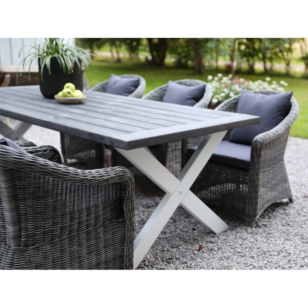 Bordet från Oxford-serien kombinerar hållbarhet och elegans med sin robusta konstruktion i gråbetsat trä och vita ben. Bordsskivan består av breda plankor som skapar ett rustikt och naturligt intryck medan de stabila kryssbenen tillför både stil och stabilitet. Designen på bordet gör det till ett perfekt val för större uteplatser eller terrasser, där det erbjuder en generös och inbjudande yta för middagar med vänner eller familj utomhus.