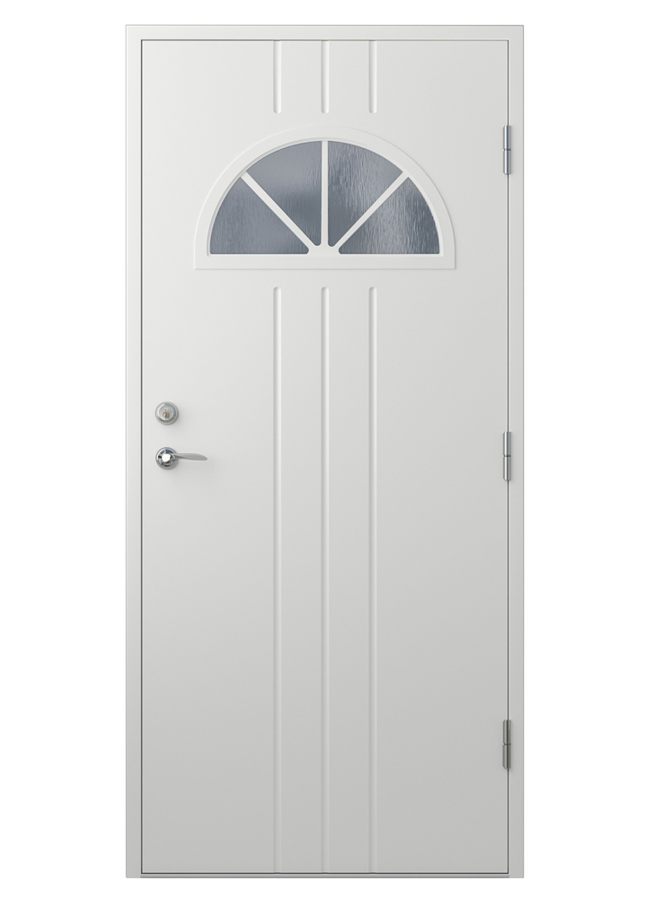 Ytterdörr Bergen har en härlig utformning med sitt halvmånefönster och spårfrästa linjer. När det hårda möter det mjuka uppstår en spänning i formgivningen som är tilltalande för ögat. Designen passar bra in bland traditionell såsom klassisk arkitektur och ger fasaden ett piggt och glatt uttryck.